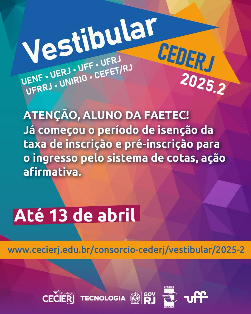 Os candidatos que desejam concorrer às vagas do Vestibular Cederj 2025.2 já podem solicitar a isenção do pagamento da taxa de inscrição e fazer a pré-inscrição no sistema de cotas, ação afirmativa e reserva de vagas para professor da rede pública. O prazo vai até 13 de abril e deve ser realizado pela página https://www.cecierj.edu.br/consorcio-cederj/vestibular/2025-2/. O Vestibular Cederj é organizado pela Fundação Cecierj, vinculada da Secretaria de Estado de Ciência, Tecnologia e Inovação.